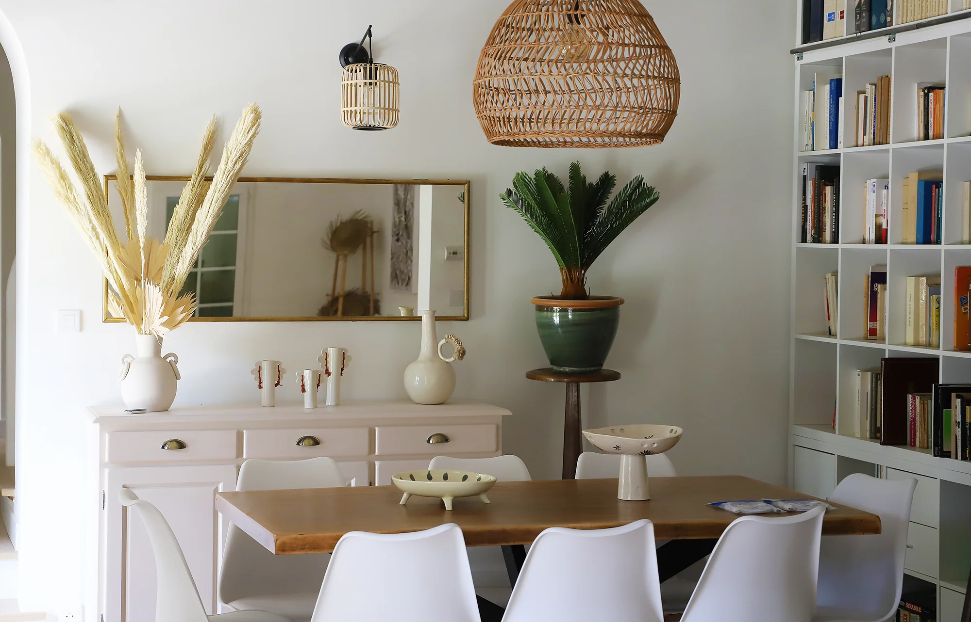 A large mirror pleasantly captures the light and seems to enlarge the room. The superb ceramics on the table and sideboard are unique creations by Maison Bonjour designer Linda Fina.